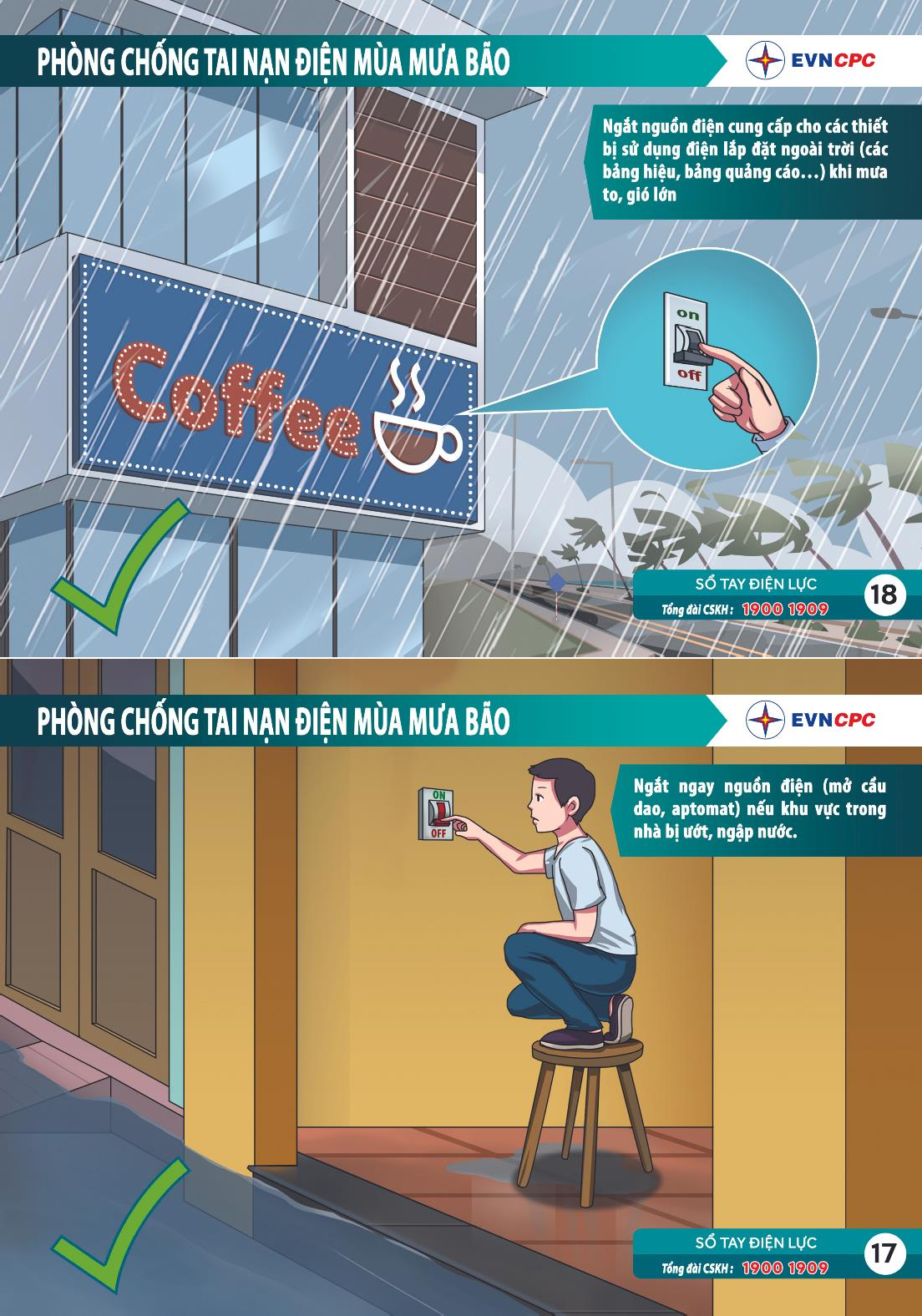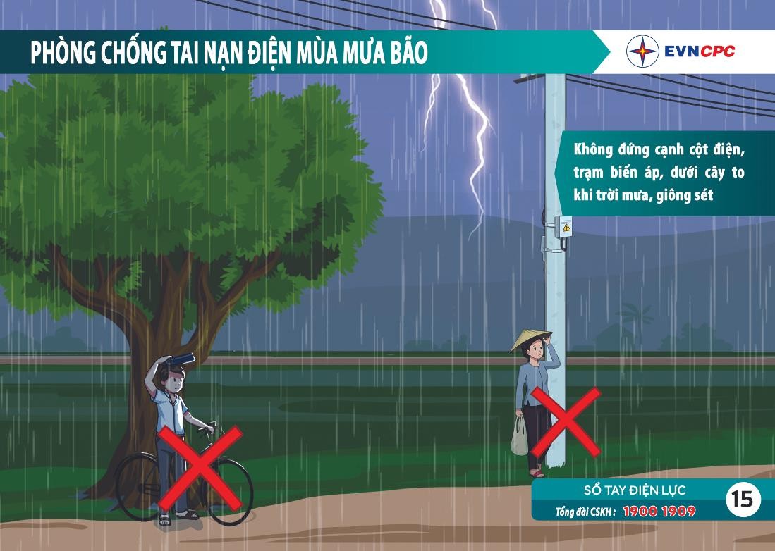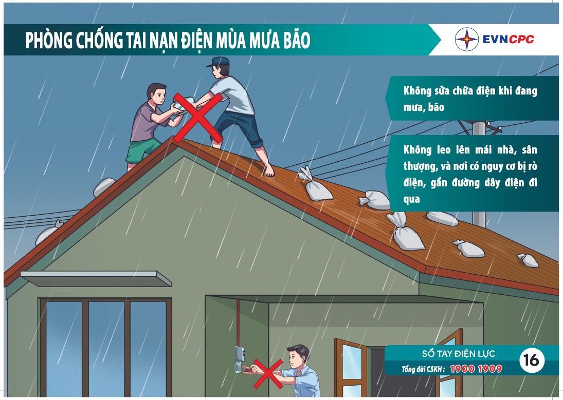 - Khi có mưa bão, giông sét: không sửa chữa điện; không leo lên mái nhà, sân thượng; không đứng gần đường dây điện.
