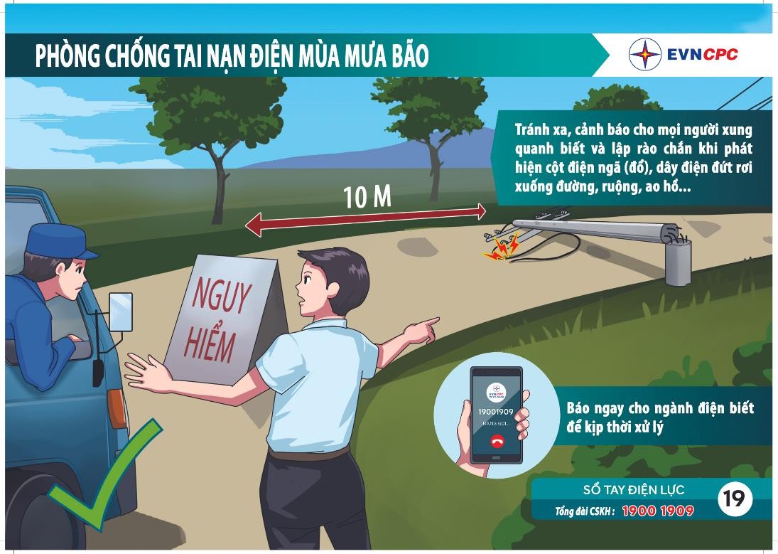 - Khi phát hiện: Dây điện đứt, cây ngã đổ vào đường dây, trạm điện, móng cột sạt lở, bị đổ phóng điện… thì không cho người, vật nuôi lại gần và báo ngay cho đơn vị quản lý điện hoặc chính quyền, công an địa phương;