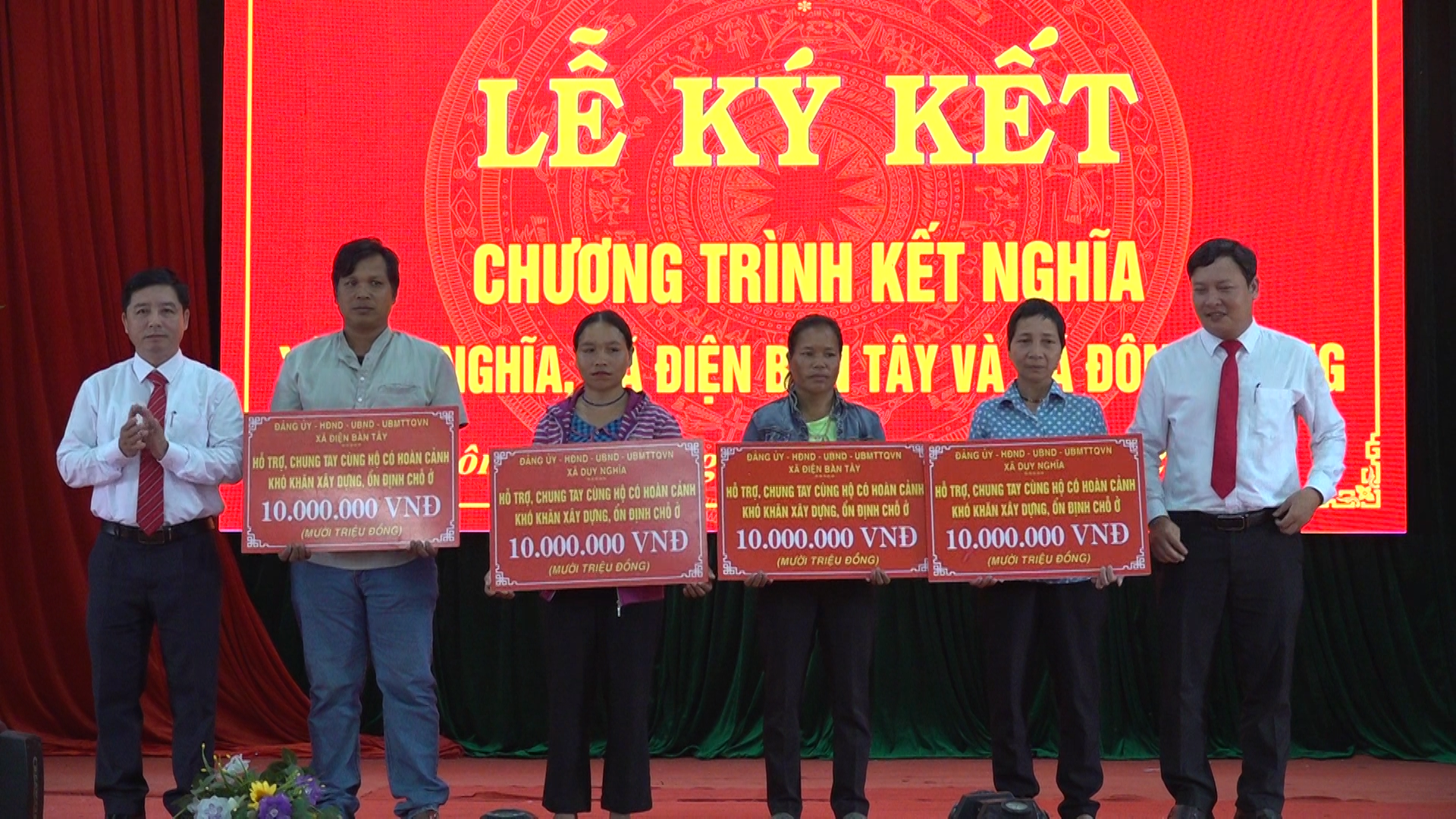 Dịp này, 02 xã Điện Bàn Tây và Duy Nghĩa đã chung tay hỗ trợ 40 triệu đồng cho 4 hộ gia đình khó khăn của xã Đông Giang xóa nhà tạm trên địa bàn xã. Xã Duy Nghĩa trao tặng người nghèo của xã Đông Giang 500 mũ bảo hiểm.