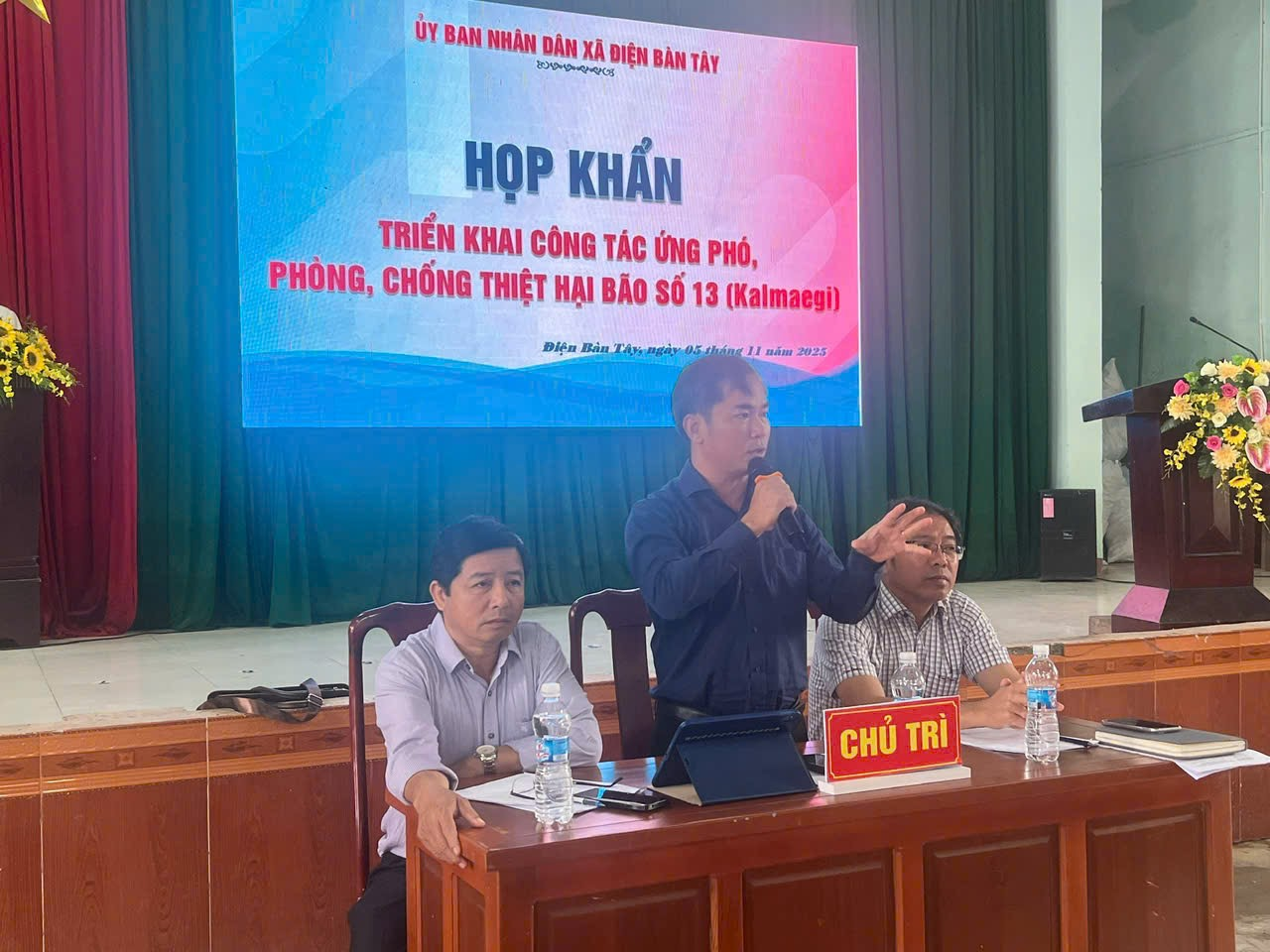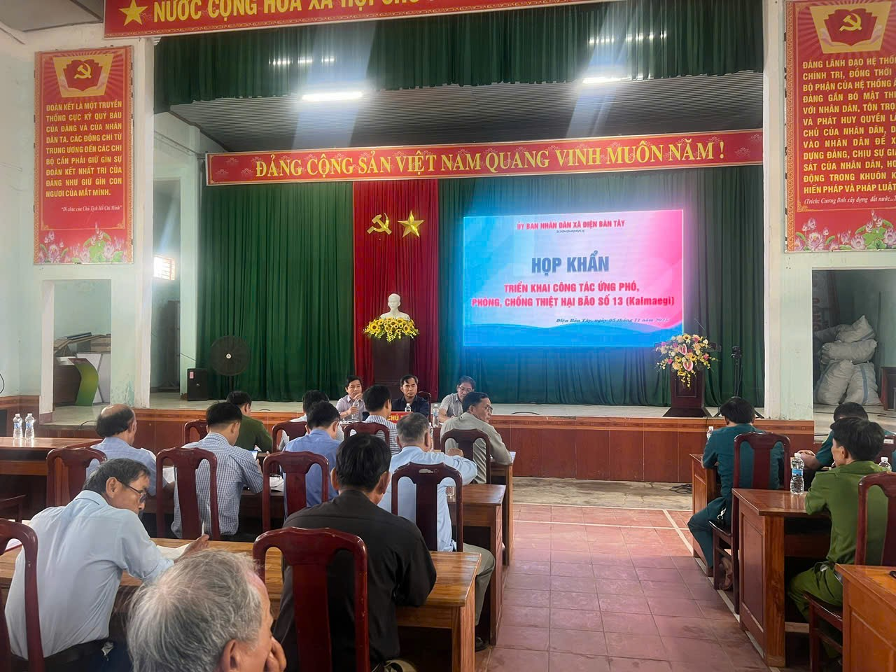 Theo tin bão mới nhất từ Trung tâm Dự báo Khí tượng Thủy văn Quốc gia, sáng sớm nay (5/11), bão KALMAEGI đã đi vào vùng biển phía Đông khu vực giữa Biển Đông thành cơn bão số 13 trên biển Đông trong năm 2025. Cơn bão này được đánh giá rất mạnh, do vậy việc chủ động ứng phó để giảm thiểu thiệt hại là hết sức cần thiết; đặc biệt trong hoàn cảnh cơn lũ lịch sử vừa mới diễn ra trên địa bàn xã. Cuộc họp nhấn mạnh tinh thần “chủ động – kịp thời – hiệu quả – an toàn”, tuyệt đối không để bị động, bất ngờ trước thiên tai. Cảnh báo cơn bão sẽ ảnh hưởng trực tiếp đến khu vực xã với nguy cơ xảy ra mưa lớn, gió giật mạnh, lũ gây ngập úng trờ lại... do vậy việc theo dõi sát diễn biến để chủ động ứng phó. Việc kiểm tra, gia cố các công trình, phương án di dời khi có tình huống khẩn cấp, trang thiết bị, vật tư dự phòng (bao tải cát, áo phao, xuồng, máy phát điện…) cần được rà soát và bổ sung là hết sức cần thiết.