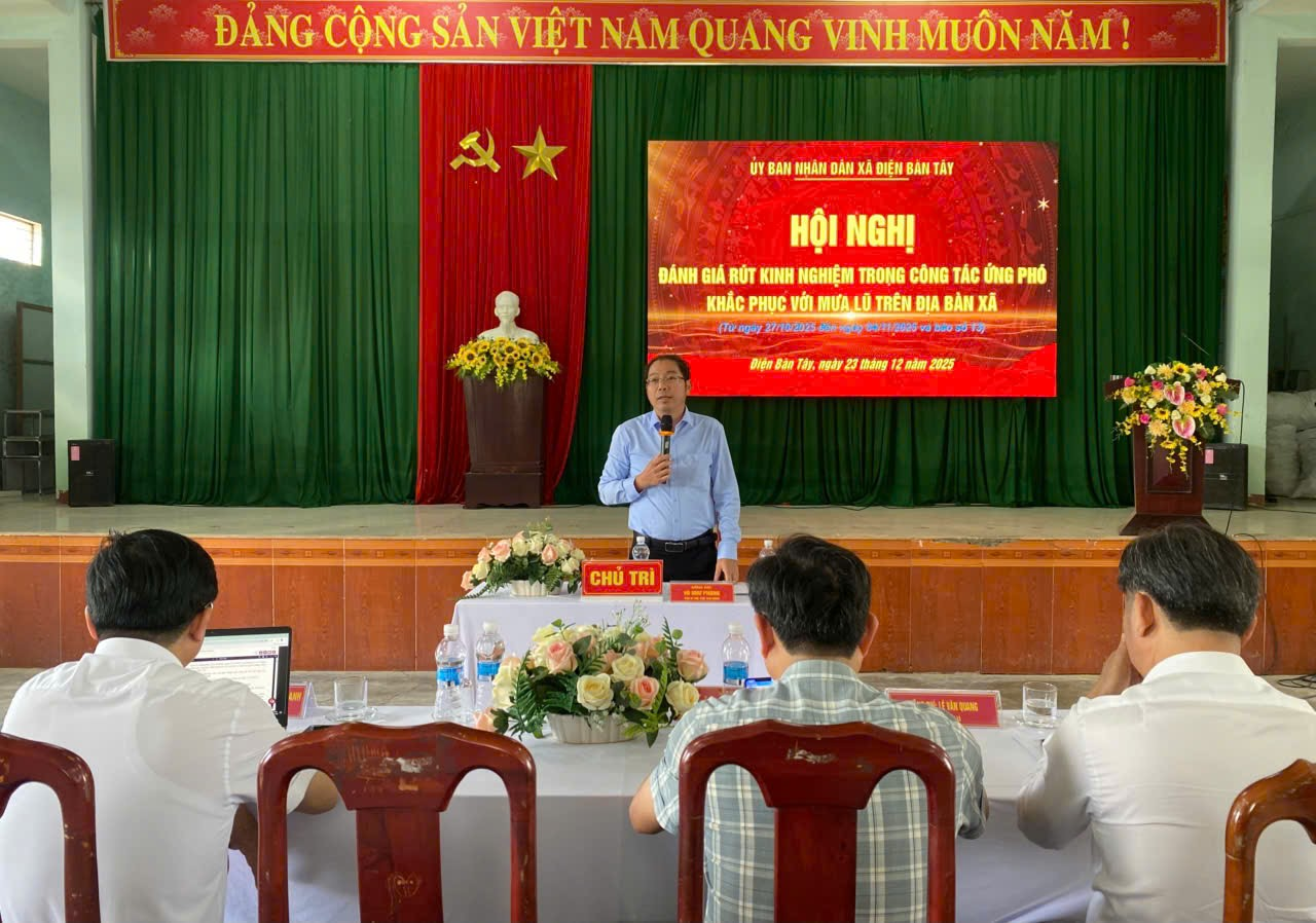 Chiều ngày 23.12, tại Hội trường UBND, UBND xã tổ chức Hội nghị đánh giá rút kinh nghiệm trong công tác ứng phó khắc phục với mưa lũ trên địa bàn xã (giai đoạn từ ngày 27.10 đến ngày 4.11.2025 và bão số 13). Tham dự có ông Lê Văn Quang - Bí thư Đảng ủy, Chủ tịch HĐND xã; ông Nguyễn Hồng Thanh - Phó Bí thư Thường trực Đảng ủy xã; ông Võ Như Phong - Phó Bí thư, Chủ tịch UBND xã, chủ trì hội nghị.