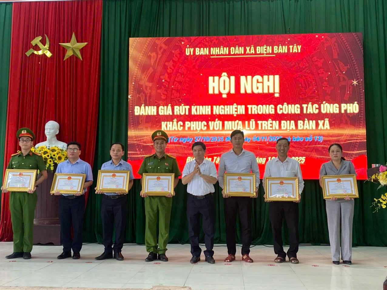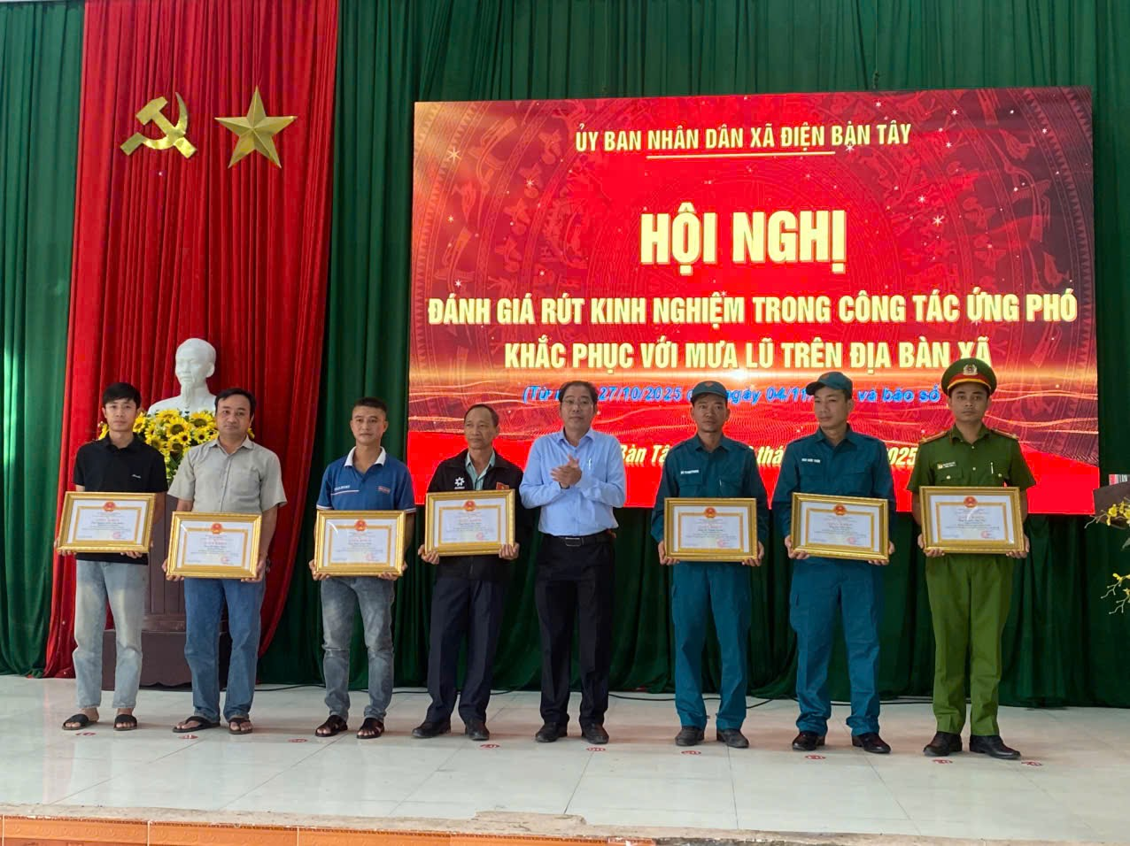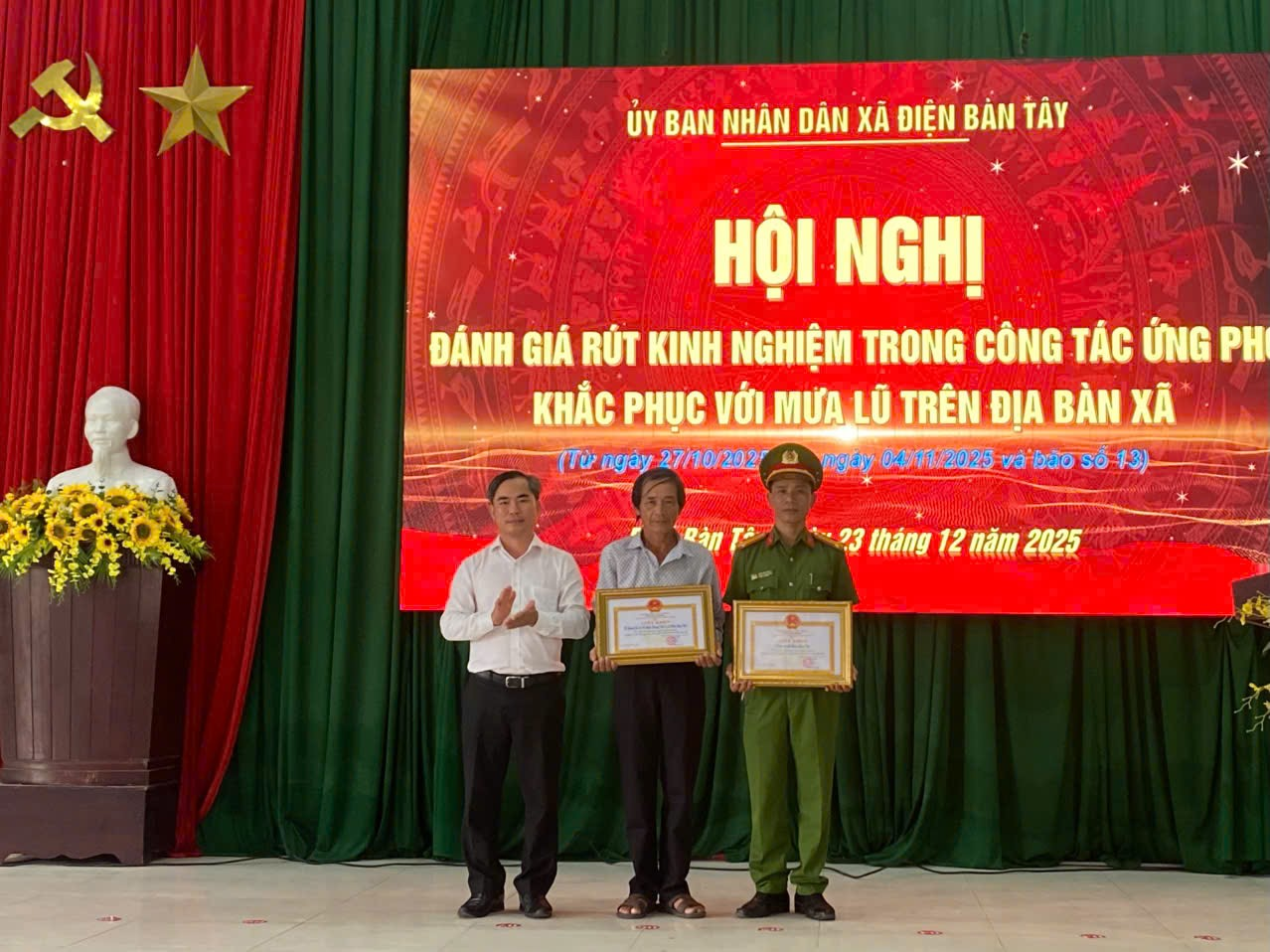 Dịp này, UBND xã đã khen thưởng cho 2 tập thể và 18 cá nhân vì đã có thành tích xuất sắc trong công tác ứng phó với mưa lũ từ ngày 27/10/2025 đến ngày 4/11/2025 và bão số 13 trên địa bàn xã Điện Bàn Tây.