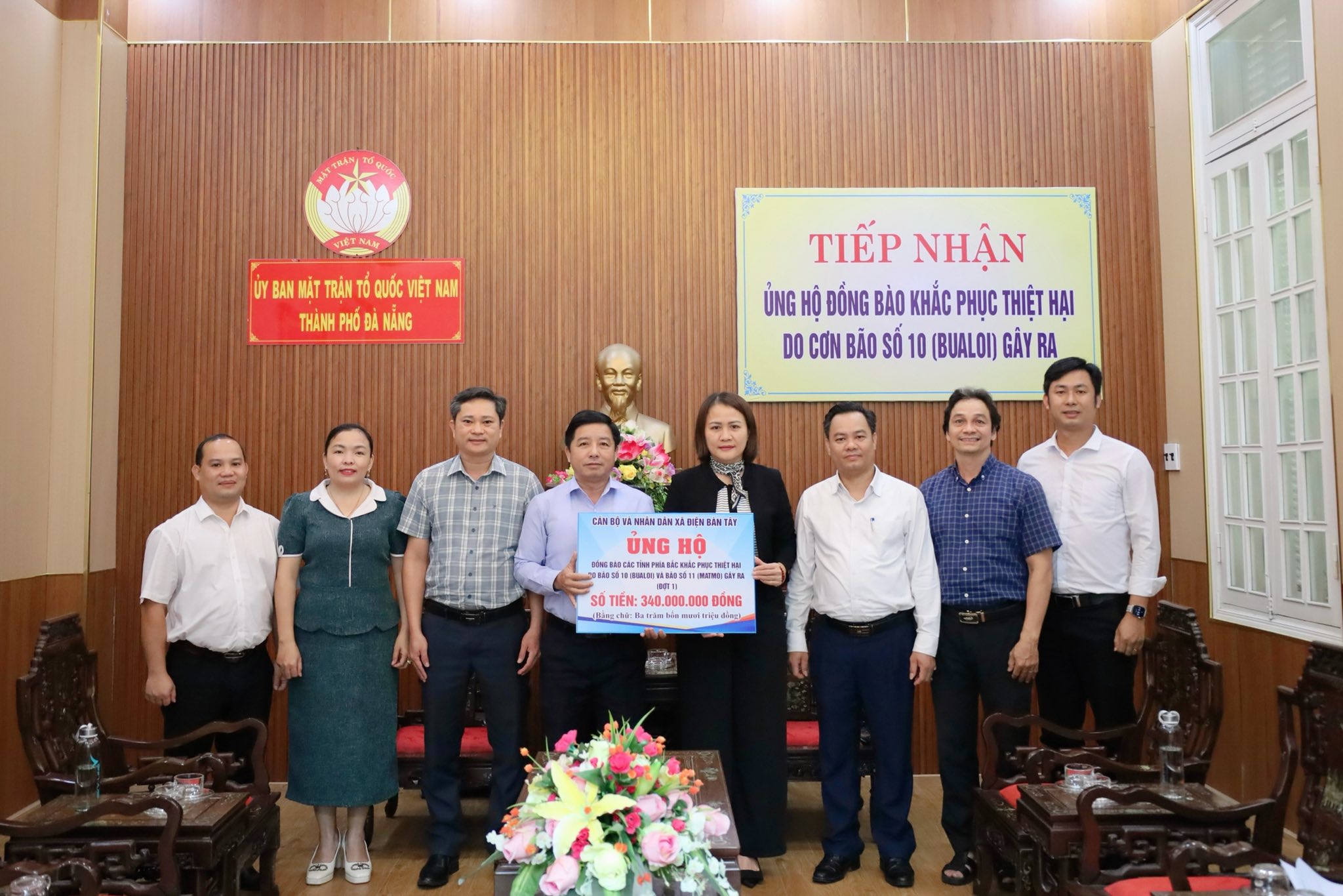 Chiều ngày 23/10/2025, Đại diện Ủy ban Mặt trận Tổ quốc Việt Nam đã trao số tiền quyên góp, ủng hộ đến Ủy ban Mặt trận Tổ quốc Việt Nam thành phố; Bà Trần Thị Mẫn - Phó Chủ tịch Ủy ban Mặt trận Tổ quốc Việt Nam thành phố đã đại diện tiếp nhận và cảm ơn sự đóng góp quý báu của các tập thể, cá nhân và Nhân dân xã Điện Bàn Tây; Bà khẳng định: “Toàn bộ số tiền 340 triệu đồng này sẽ được chuyển đến Ủy ban Mặt trận Tổ quốc Việt Nam cấp trên để kịp thời chuyển tới đồng bào miền Bắc bị thiệt hại do bão số 10, đảm bảo công khai, minh bạch và đúng quy định.”
